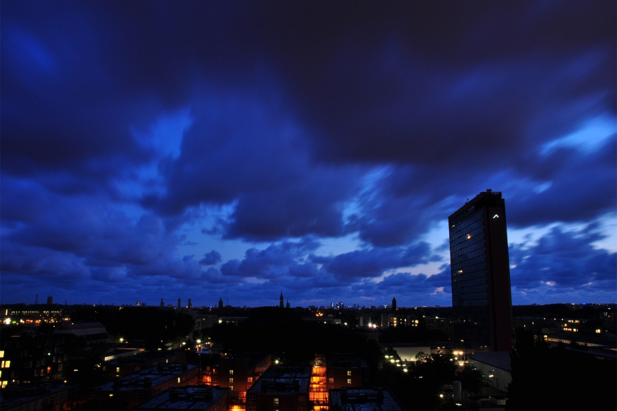 A high-dynamic range image of a sunset in Delft. Composed of three bracketed exposures followed by some additional editing.